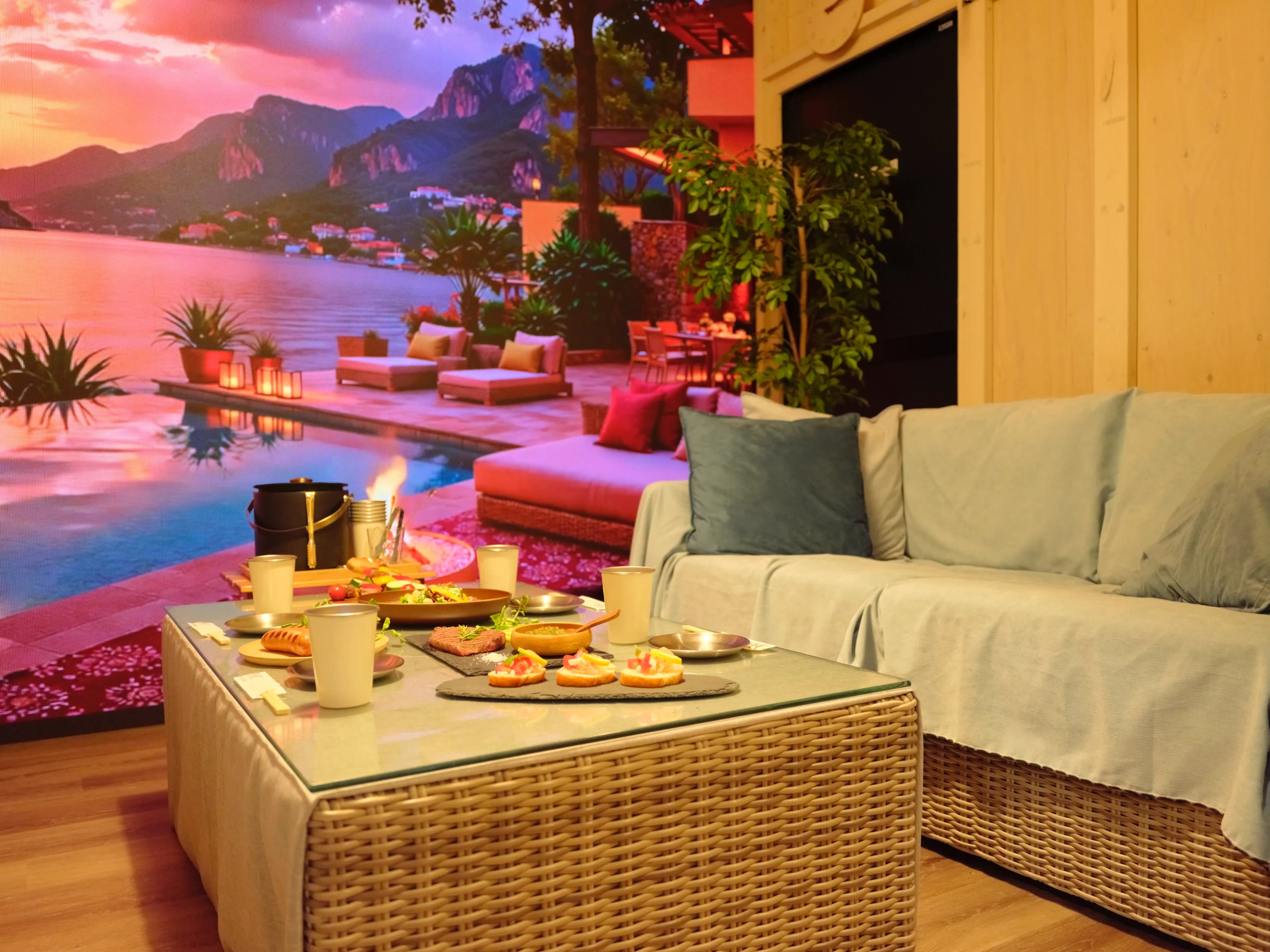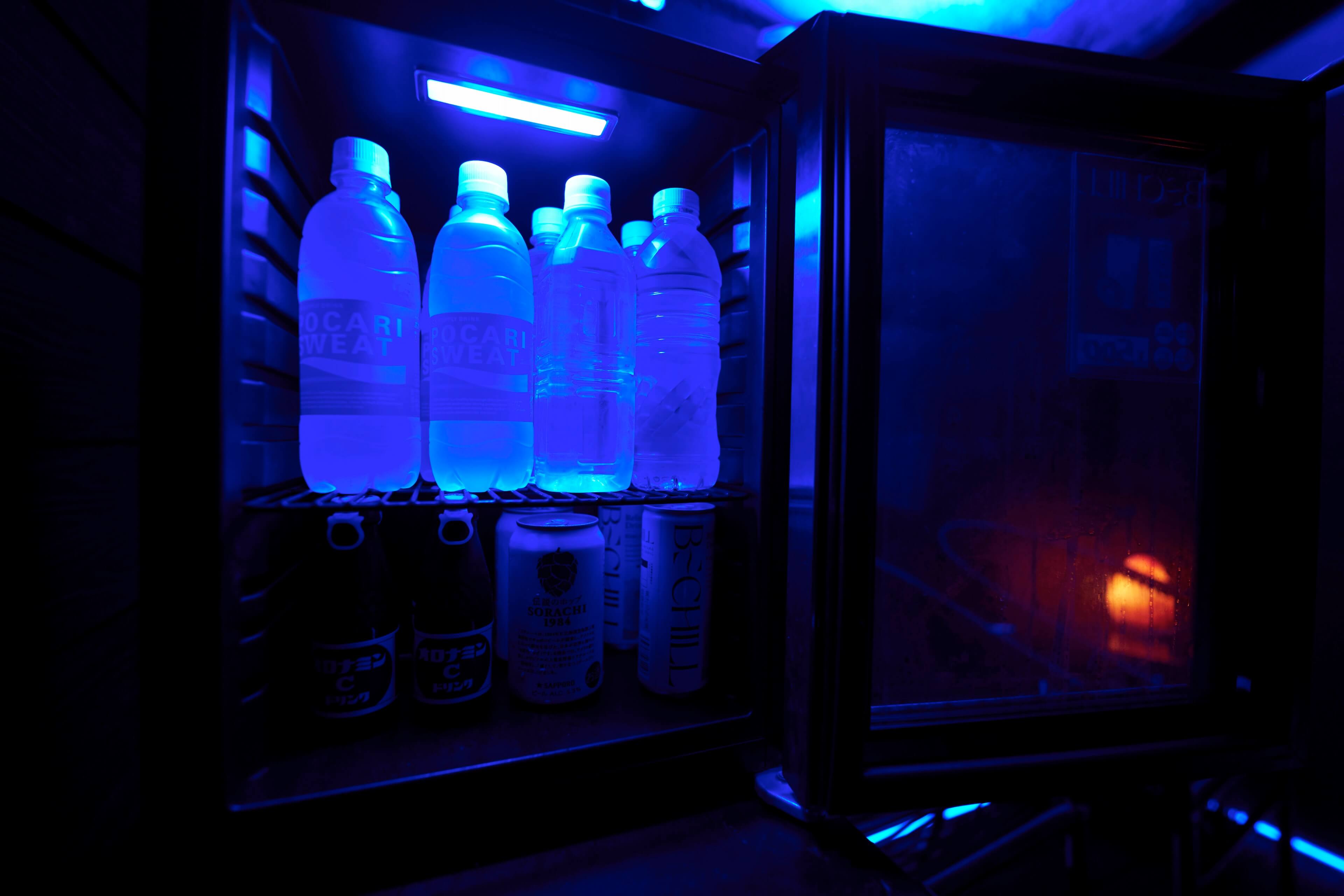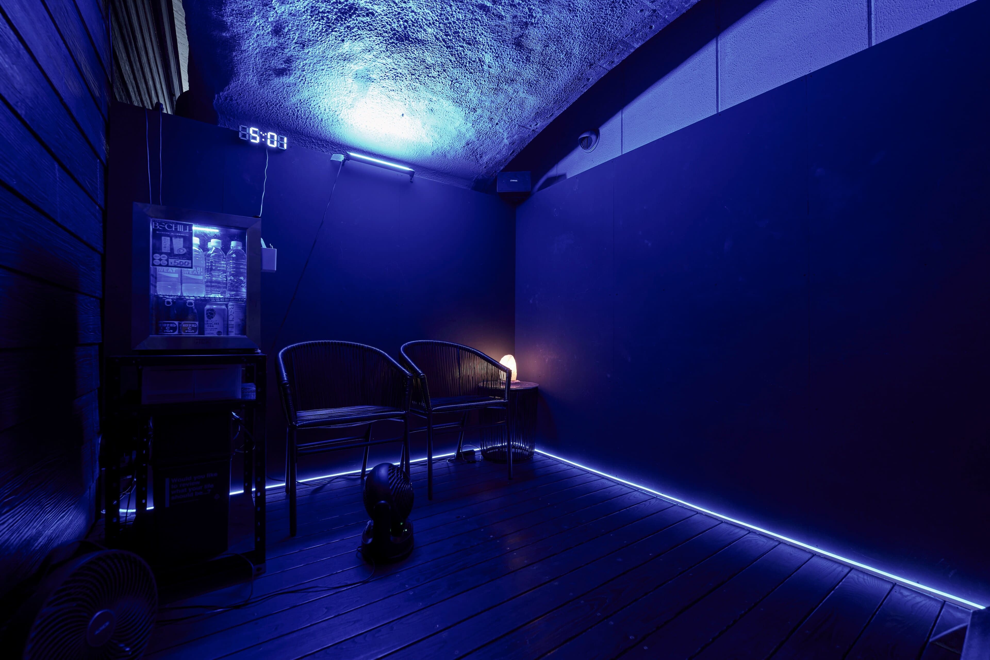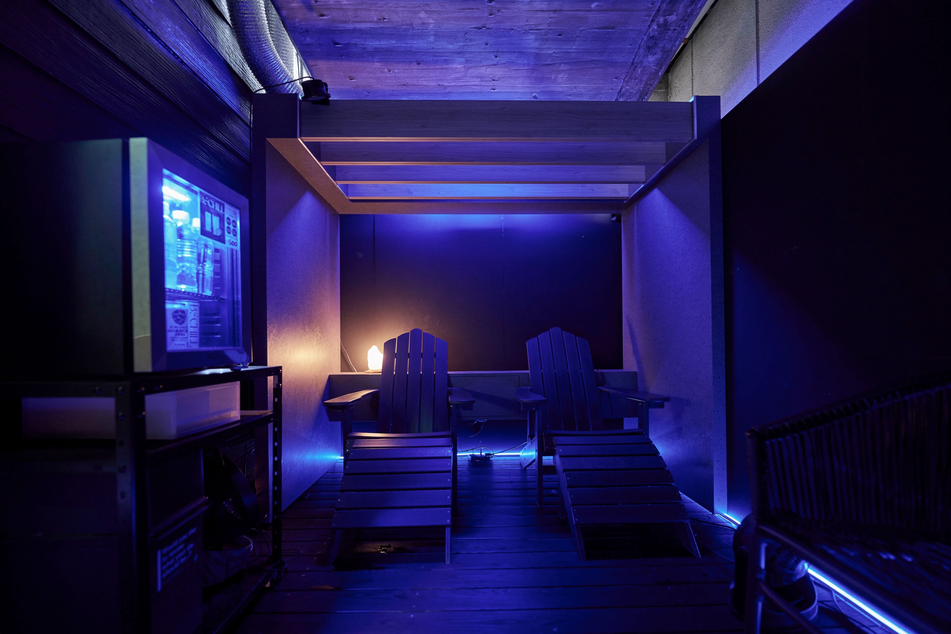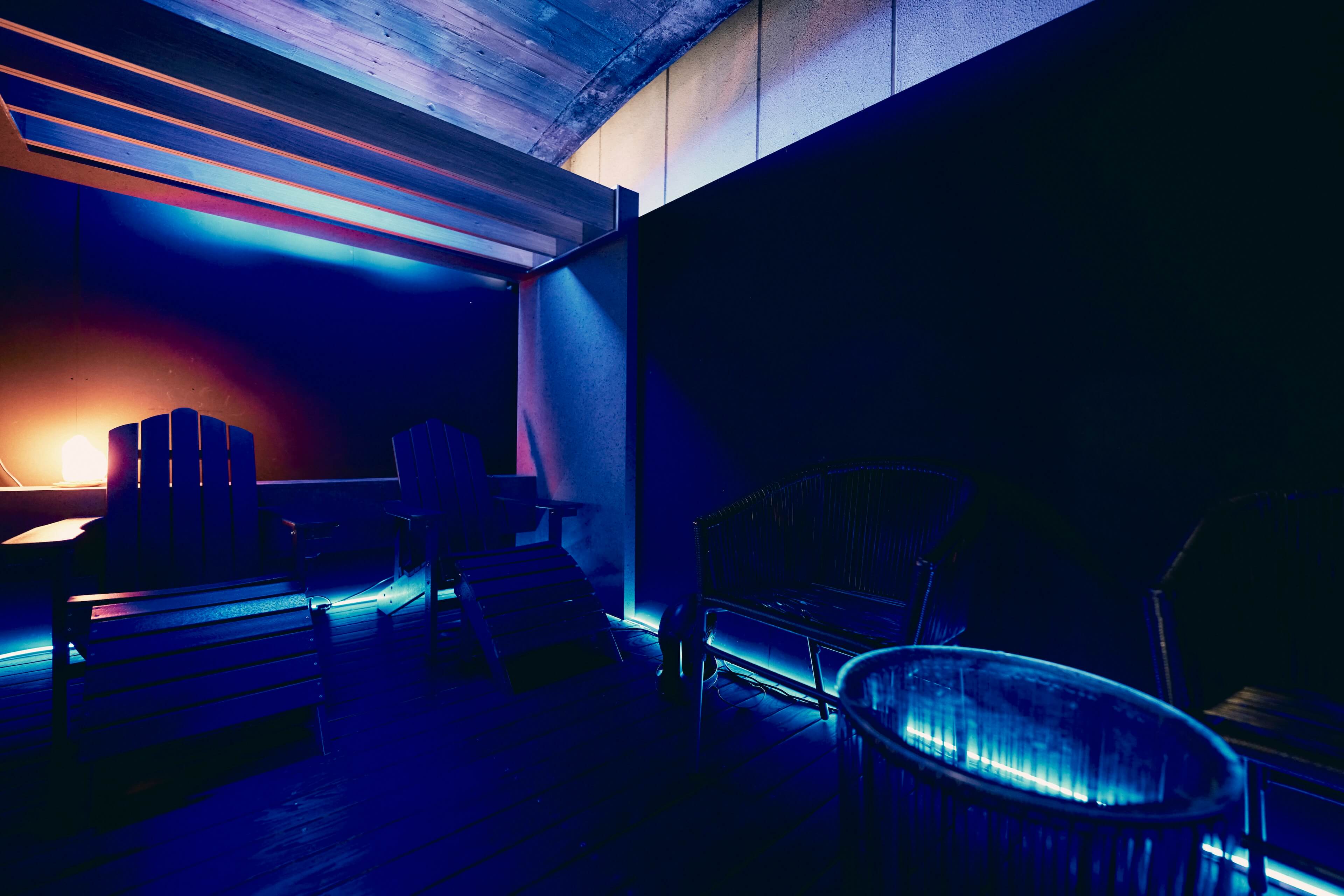 すこし暗めな外気浴スペースで集中した”ととのい”をご体験ください。専用の冷蔵庫のドリンクもお楽しみいただけます。